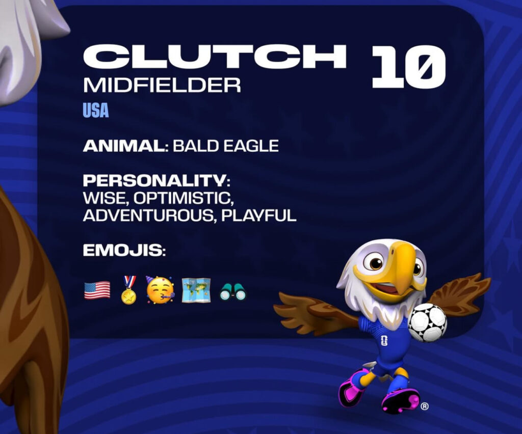 El águila Clutch™ recorre los Estados Unidos con un espíritu insaciable, una curiosidad sin límites y un optimismo inquebrantable. Se familiariza con todas las culturas y disfruta cada partido y cada momento al máximo. Audaz dentro del campo y fuente de inspiración fuera de él, Clutch™ predica con el ejemplo levantando el ánimo de su equipo con energía y determinación, y convirtiendo cada reto en una oportunidad para alcanzar nuevas metas. Clutch™ tiene una personalidad arrolladora y le encanta el deporte. Como todo buen centrocampista, es capaz de unir a las personas que le rodean en cualquier ambiente y es un ejemplo de que para volar alto solo hay que mostrar voluntad, pasión y darlo todo en el campo.