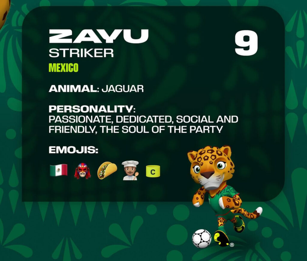 El jaguar Zayu™ habita en las selvas del sur de México y encarna el valioso patrimonio y el dinamismo del país. Zayu™, cuyo nombre significa “unidad”, “fortaleza” y “alegría”, es un delantero que se transforma en el terreno de juego, donde intimida a los defensores con su excepcional agilidad y velocidad. Fuera del campo, promueve la cultura mexicana a través del baile, la gastronomía y la tradición, además de unir a personas de diferentes países con su pasión y orgullo.