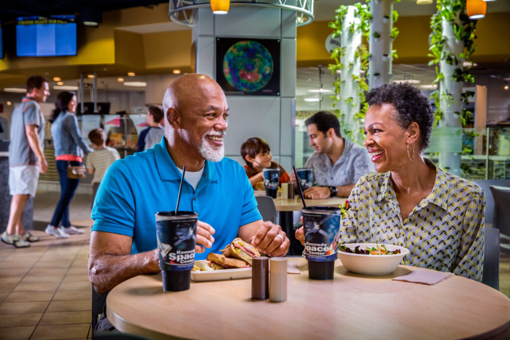 - Moon Rock Café: Ubicado en el Apollo/Saturn V Center, ofrece un menú perfecto para quienes desean almorzar rodeados de la historia de las misiones Apollo. El menú incluye opciones para llevar, así como pollo empanizado, sándwiches y mucho más.
