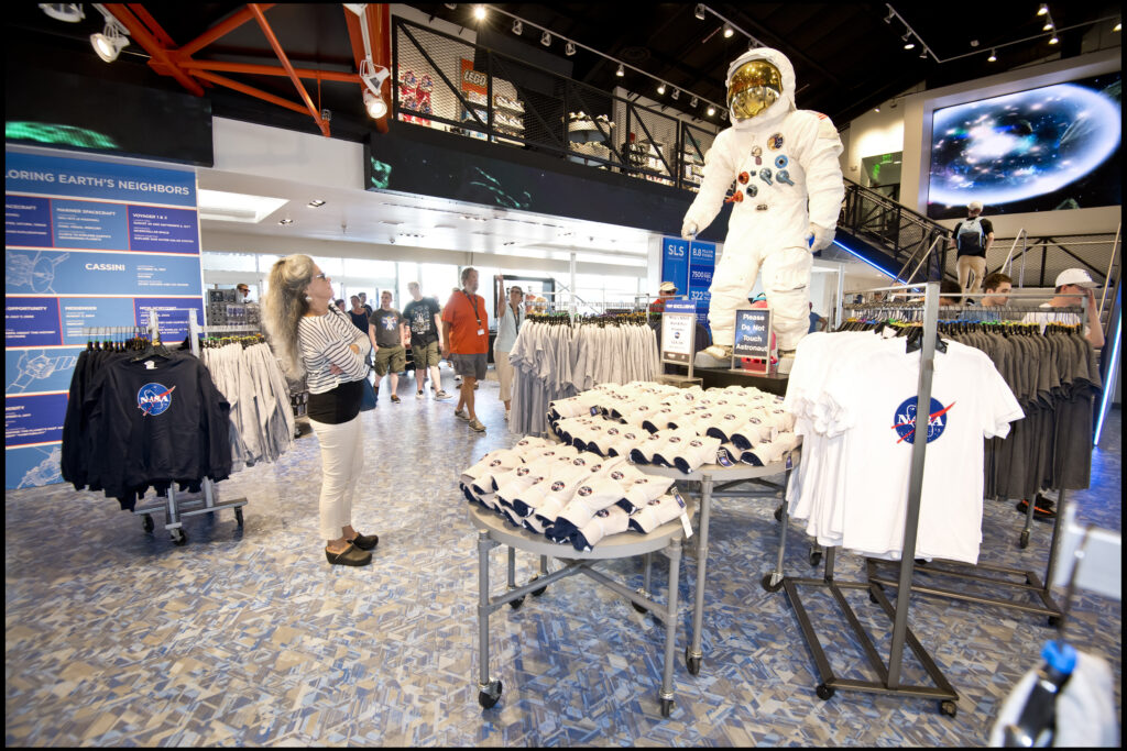 Con una superficie de 1.428 m², la Space Shop (Tienda Espacial) reúne la más amplia selección de productos espaciales del planeta, desde souvenirs y objetos de colección hasta los últimos lanzamientos de la NASA. Ofrece opciones de souvenirs, experiencias interactivas y un punto culminante imperdible: en la segunda planta, los visitantes pueden seguir los pasos de los astronautas al cruzar la histórica plataforma utilizada en la misión Apolo 11. Es el escenario perfecto para capturar un momento inolvidable.
