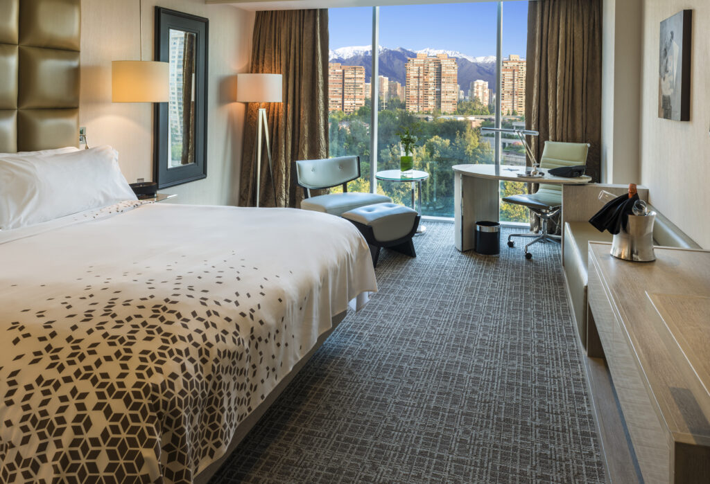 Con un enfoque hacia el público ejecutivo, el hotel ofrece 181 amplias habitaciones con tres estilos de diseño: Chilena, Europea y Contemporánea. Todas incluyen espacios de trabajo modernos, camas premium, acceso inalámbrico a Internet y una decoración elegante. La propuesta se complementa con ocho salones, restaurante CATAE, cuatro bares, piscina al aire libre, gimnasio y spa, todos con un interiorismo cuidadosamente pensado para brindar confort y sofisticación.