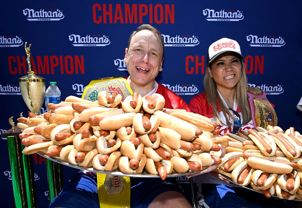 El gran protagonista es el estadounidense Joey Chestnut, campeón vigente tras ingerir 70,5 hot dogs con pan en la última edición. Chestnut ganó 17 de las últimas 19 competencias y ostenta el récord histórico de 76 hot dogs, logrado en 2021.