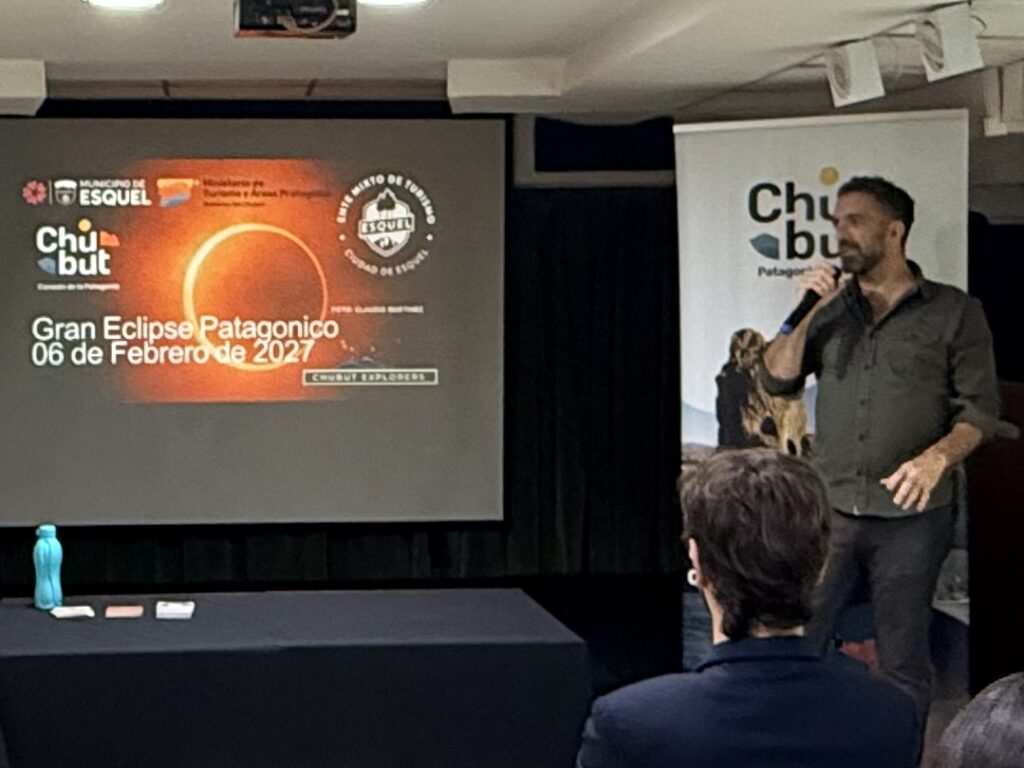 “Esquel se está consolidando como uno de los destinos más atractivos de la Patagonia, no solo por la belleza de su entorno natural, sino también por su capacidad de ofrecer experiencias únicas durante todo el año, con eventos de relevancia internacional como el eclipse solar que posicionan a la región en el mapa global del turismo”, afirmó Sebastián Sarfield, director regional Delegación CABA del Ministerio de Turismo y Áreas Protegidas del Chubut (foto).